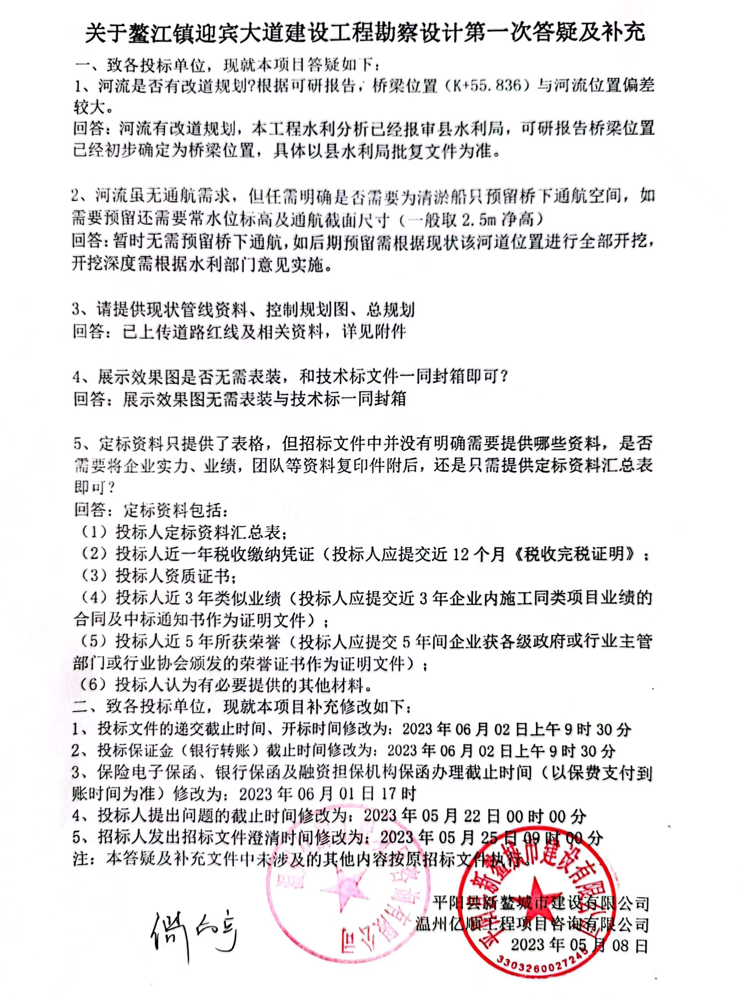 关于鳌江镇迎宾大道建设工程勘察设计第一次答疑及补充