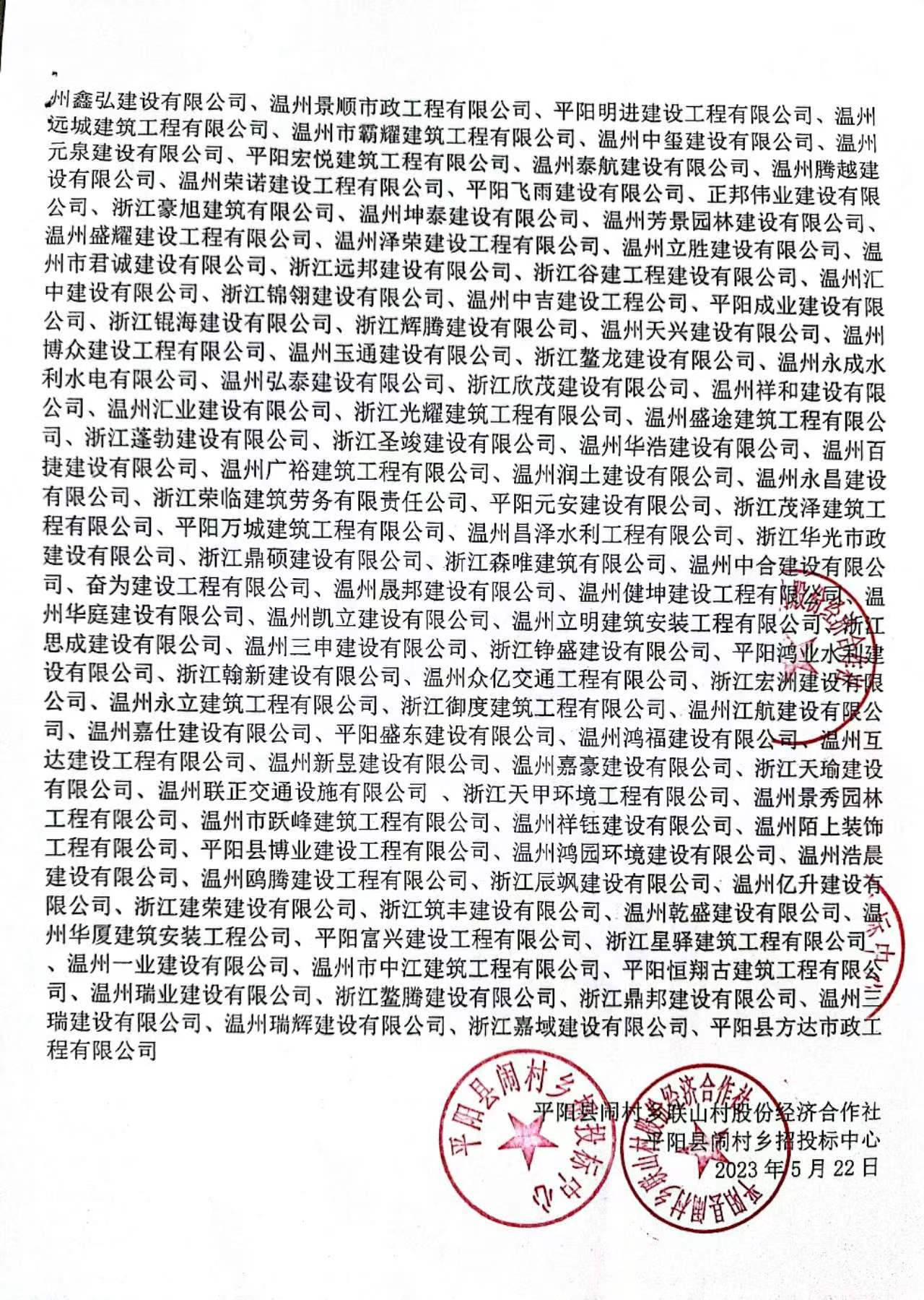 温州瑞奕建设有限公司、温州鸿顺建设有限公司、温州万宸建设有限公司、温州聿田建设有限公司、平阳明盛建设有限公司、浙江博厦建设有限公司、温州锐胜建设有限公司、温州辰飞建设有限公司、温州凯睿建设有限公司、温州市浩文建筑工程有限公司、浙江通力市政园林工程有限公司、温州展业建设工程有限公司、浙江仁骋建设工程有限公司、浙江首豪建设有限公司、温州一鸿建设工程有限公司 温州博睿建设有限公司、温州鑫弘建设有限公司、温州景顺市政工程有限公司、平阳明进建设工程有限公司、温州远城建筑工程有限公司、温州市霸耀建筑工程有限公司、温州中玺建设有限公司、温州元泉建设有限公司、平阳宏悦建筑工程有限公司、温州泰航建设有限公司、温州腾越建设有限公司、温州荣诺建设工程有限公司、平阳飞雨建设有限公司、正邦伟业建设有限公司、浙江豪旭建筑有限公司、温州坤泰建设有限公司、温州芳景园林建设有限公司、温州盛耀建设工程有限公司、温州泽荣建设工程有限公司、温州立胜建设有限公司、温州市君诚建设有限公司、浙江远邦建设有限公司、浙江谷建工程建设有限公司、温州汇中建设有限公司、浙江锦翎建设有限公司、温州中吉建设工程公司、平阳成业建设有限公司、浙江锟海建设有限公司、浙江辉腾建设有限公司、温州天兴建设有限公司、温州博众建设工程有限公司、温州玉通建设有限公司、浙江鳌龙建设有限公司、温州永成水利水电有限公司、温州弘泰建设有限公司、浙江欣茂建设有限公司、温州祥和建设有限公司、温州汇业建设有限公司、浙江光耀建筑工程有限公司、温州盛途建筑工程有限公司、浙江蓬勃建设有限公司、浙江圣竣建设有限公司、温州华浩建设有限公司、温州百捷建设有限公司、温州广裕建筑工程有限公司、温州润土建设有限公司、温州永昌建设有限公司、浙江荣临建筑劳务有限责任公司、平阳元安建设有限公司、浙江茂泽建筑工程有限公司、平阳万城建筑工程有限公司、温州昌泽水利工程有限公司、浙江华光市政建设有限公司、浙江鼎硕建设有限公司、浙江森唯建筑有限公司、温州中合建设有限公司、奋为建设工程有限公司、温州晟邦建设有限公司、温州健坤建设工程有限公司、温州华庭建设有限公司、温州凯立建设有限公司、温州立明建筑安装工程有限公司、浙江思成建设有限公司、温州三申建设有限公司、浙江铮盛建设有限公司、平阳鸿业水利建设有限公司、浙江翰新建设有限公司、温州众亿交通工程有限公司、浙江宏洲建设有限公司、温州永立建筑工程有限公司、浙江御度建筑工程有限公司、温州江航建设有限公司、温州嘉仕建设有限公司、平阳盛东建设有限公司、温州鸿福建设有限公司、温州互达建设工程有限公司、温州新昱建设有限公司、温州嘉豪建设有限公司、浙江天瑜建设有限公司、温州联正交通设施有限公司 、浙江天甲环境工程有限公司、温州景秀园林工程有限公司、温州市跃峰建筑工程有限公司、温州祥钰建设有限公司、温州陌上装饰工程有限公司、平阳县博业建设工程有限公司、温州鸿园环境建设有限公司、温州浩晨建设有限公司、温州鸥腾建设工程有限公司、浙江辰飒建设有限公司、温州亿升建设有限公司、浙江建荣建设有限公司、浙江筑丰建设有限公司、温州乾盛建设有限公司、温州华厦建筑安装工程公司、平阳富兴建设工程有限公司、浙江星驿建筑工程有限公司、温州一业建设有限公司、温州市中江建筑工程有限公司、平阳恒翔古建筑工程有限公司、温州瑞业建设有限公司、浙江鳌腾建设有限公司、浙江鼎邦建设有限公司、温州三瑞建设有限公司、温州瑞辉建设有限公司、浙江嘉域建设有限公司、平阳县方达市政工程有限公司