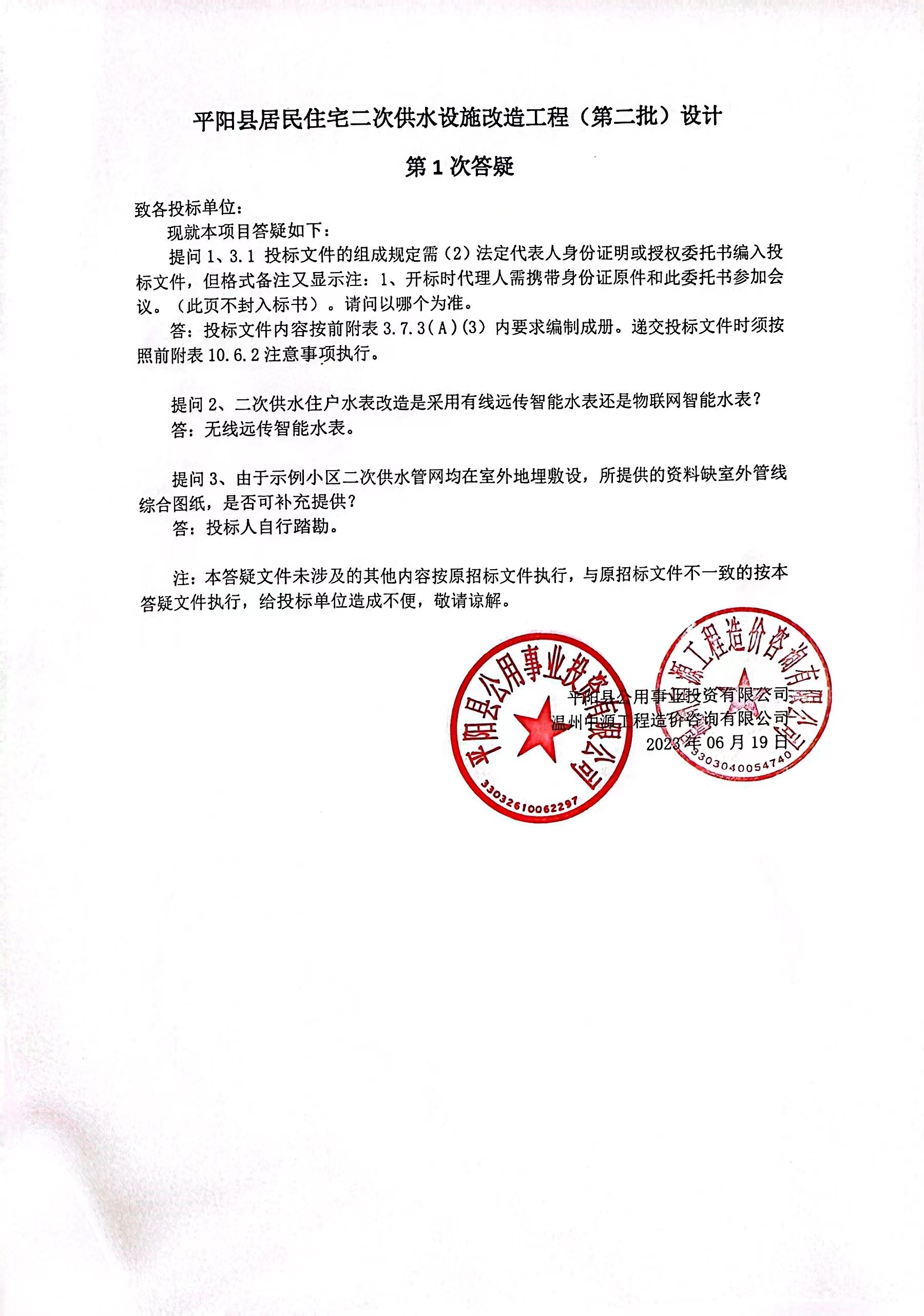 注:本答疑文件未涉及的其他内容按原招标文件执行,与原招标文件不一致的按本答疑文件执行,给投标单位造成不便,敬请谅解。