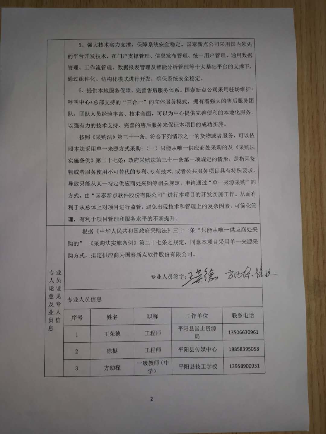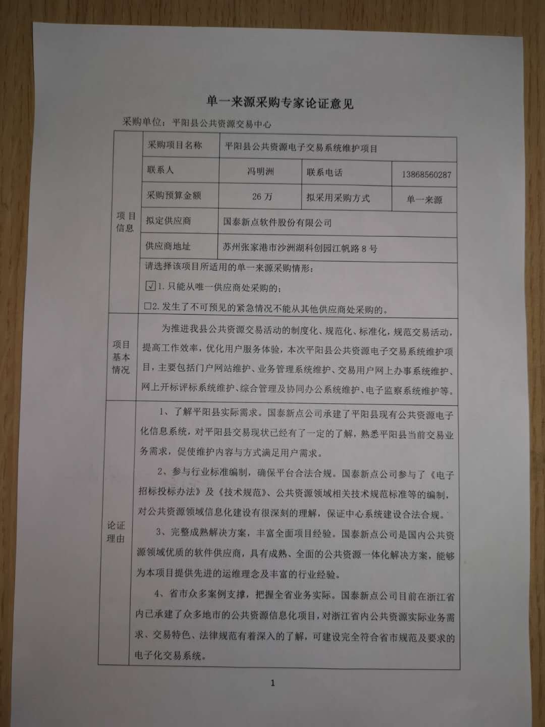 采用单一来源采购方式的原因及说明:采购人与江苏国泰新点软件有限公司于2012年8月开始共同开发平阳县公共资源交易中心电子招投标系统,2017年7月通过验收。本项目属于系统建设与维护的技术延续性及功能拓展性的服务内容。
